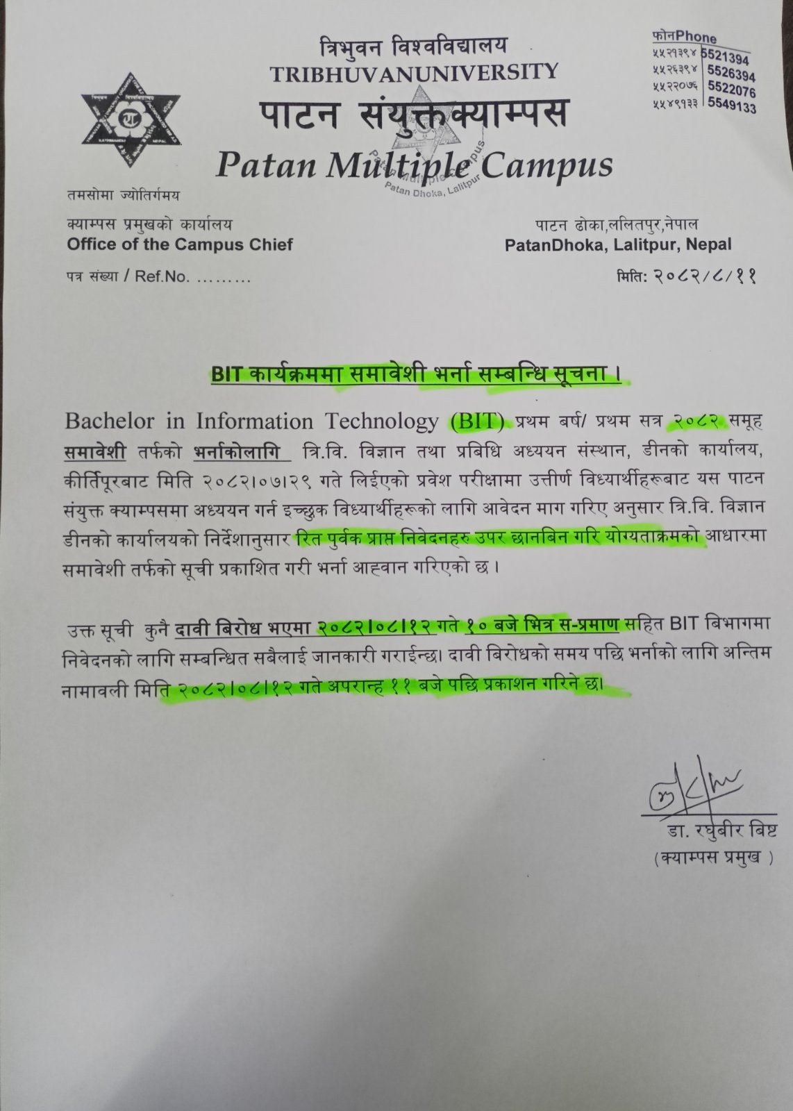 BIT समावेशी तर्फको भर्ना सूची प्रकशित गरिएको सूचना