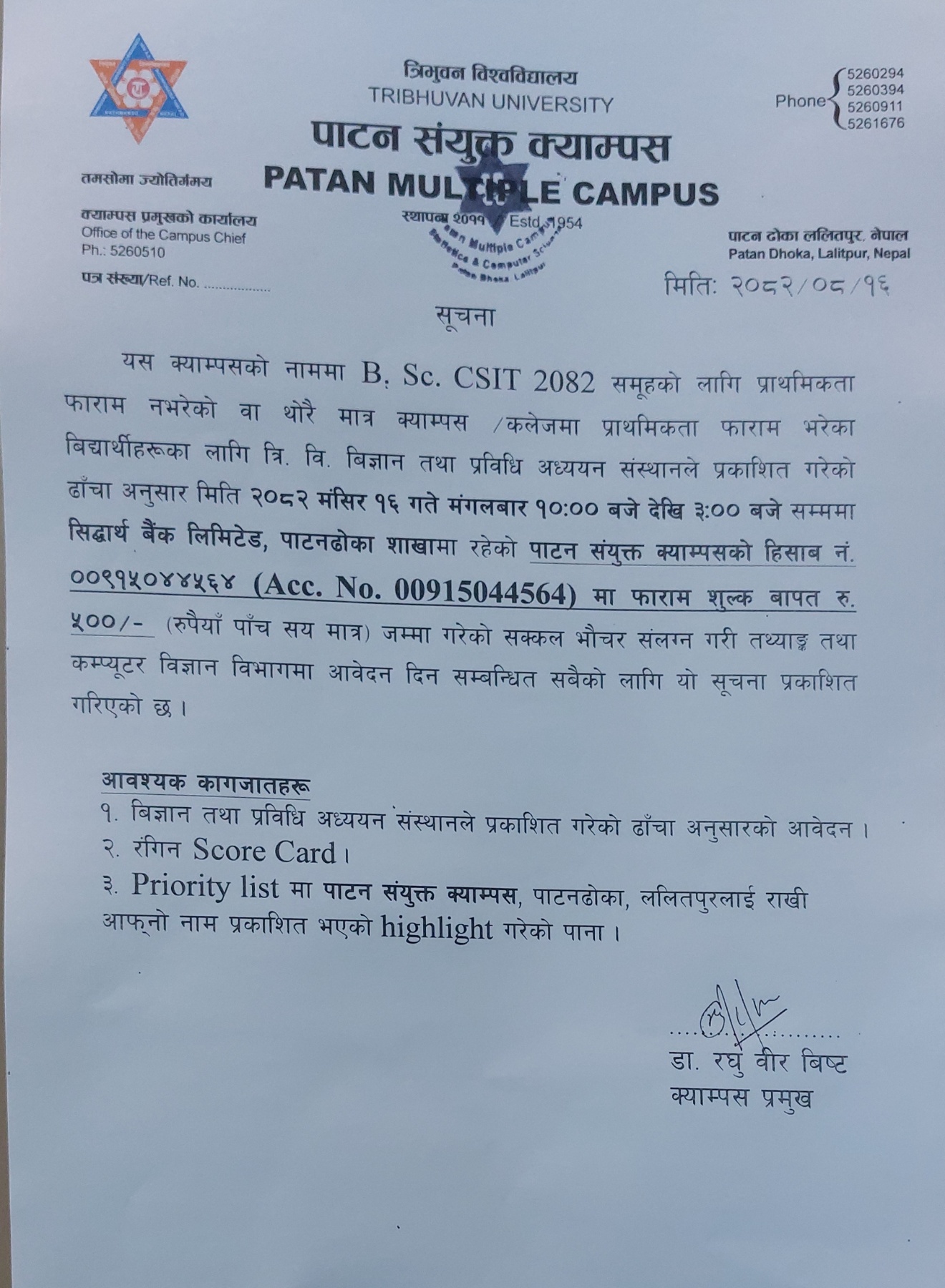 बि.सि.ए र एम.सि.ए कार्यक्रममा निशुल्क तथा जेहेन्दार बिद्यार्थीहरुको छात्रवृतिका लागि निबेदन बुझाउने सम्बन्धि सूचना