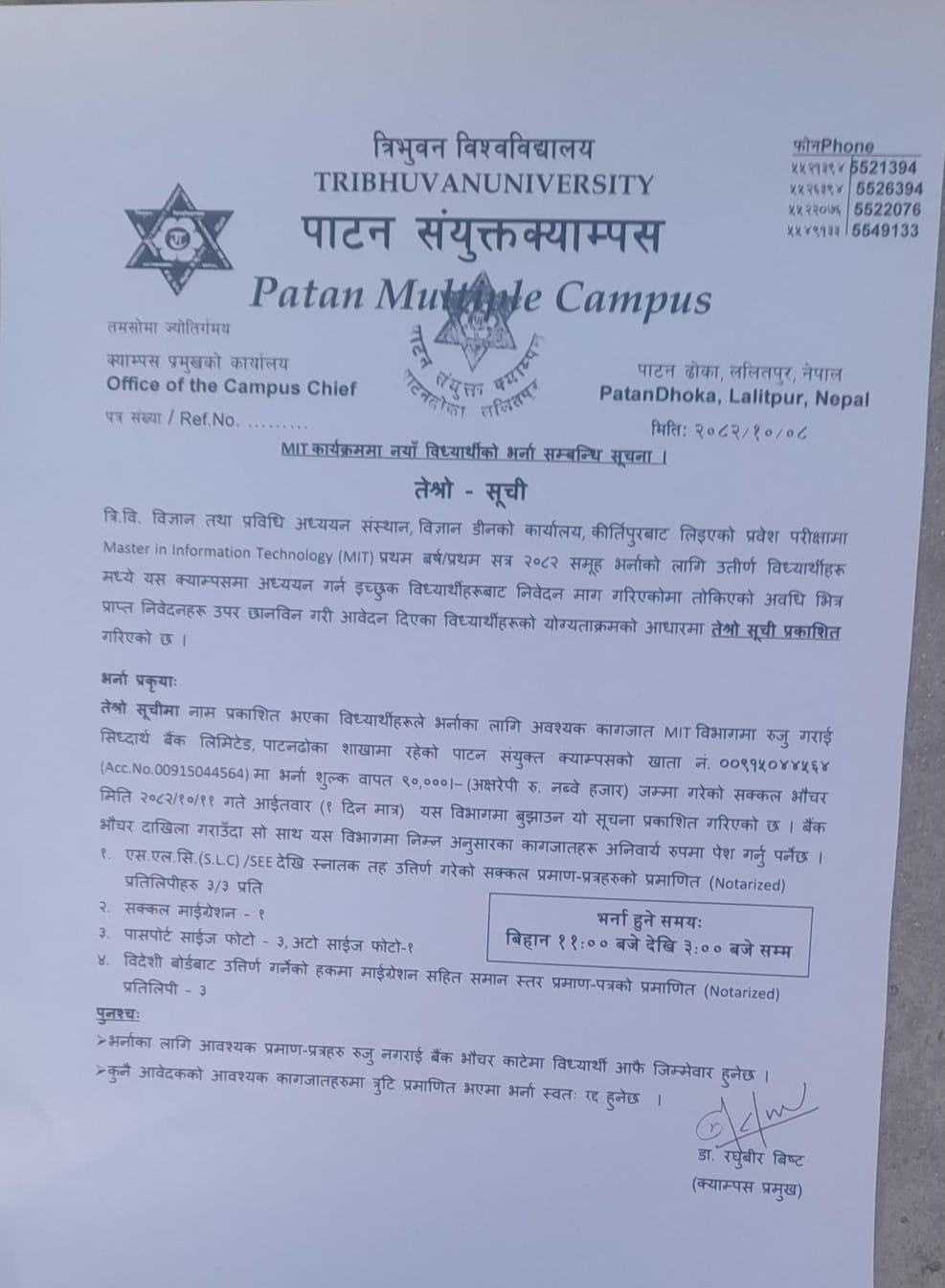 बि.सि.ए र एम.सि.ए कार्यक्रममा निशुल्क तथा जेहेन्दार बिद्यार्थीहरुको छात्रवृतिका लागि निबेदन बुझाउने सम्बन्धि सूचना