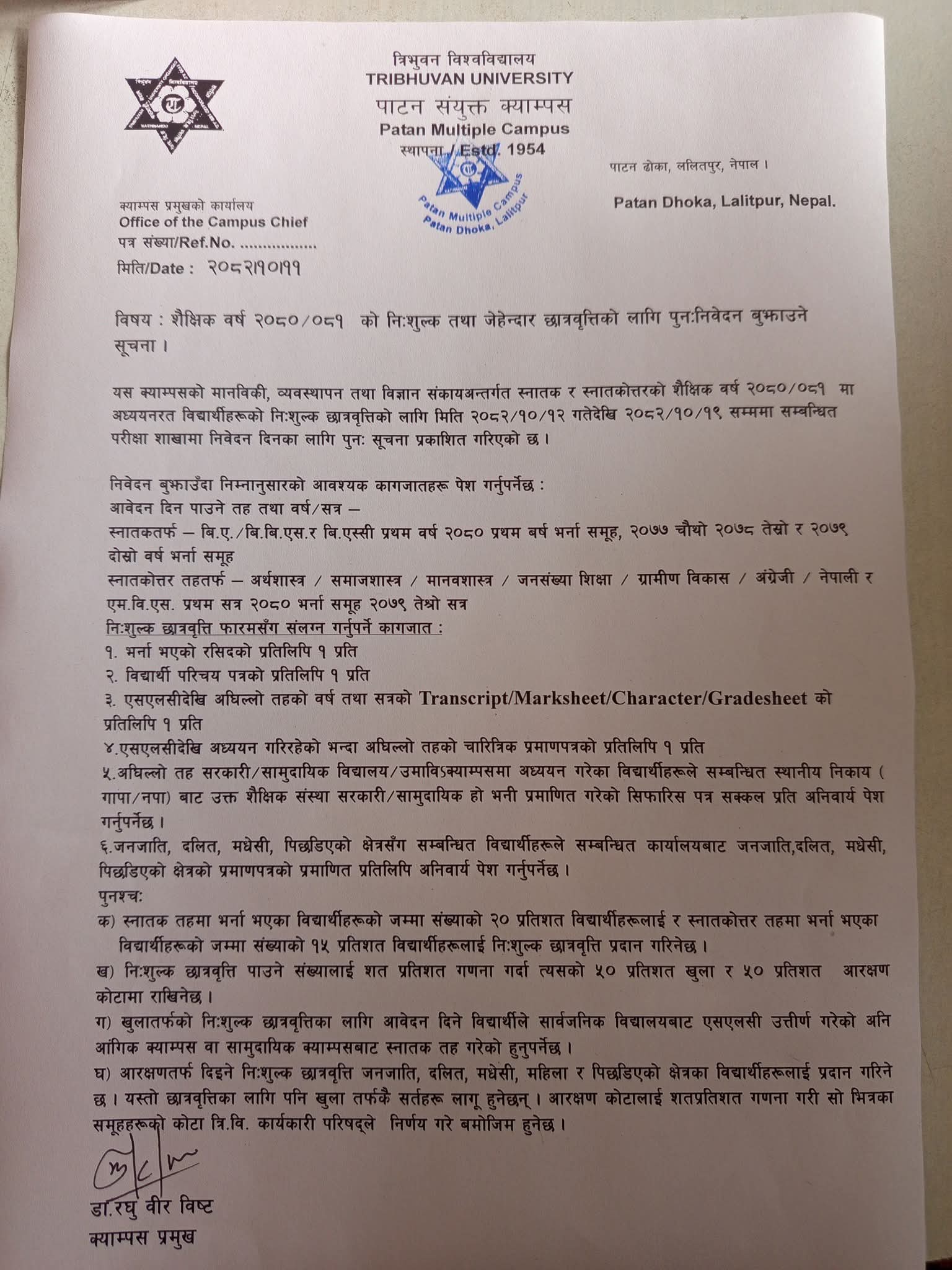 बि.सि.ए र एम.सि.ए कार्यक्रममा निशुल्क तथा जेहेन्दार बिद्यार्थीहरुको छात्रवृतिका लागि निबेदन बुझाउने सम्बन्धि सूचना