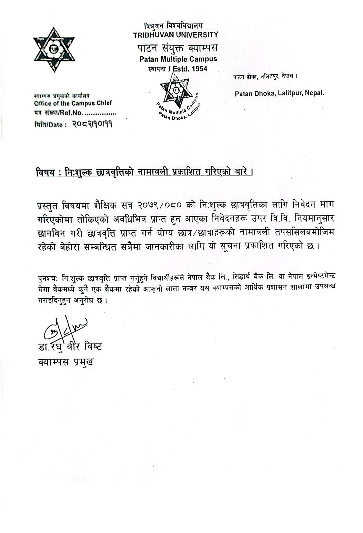 निशुल्क छात्रवृति नामावली प्रकाशित गरिएको बारे