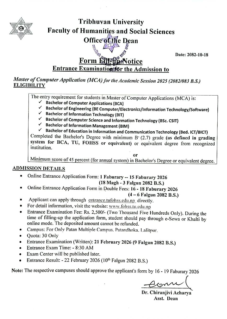 MCA-Entrance Form Fill Up Notice 2082