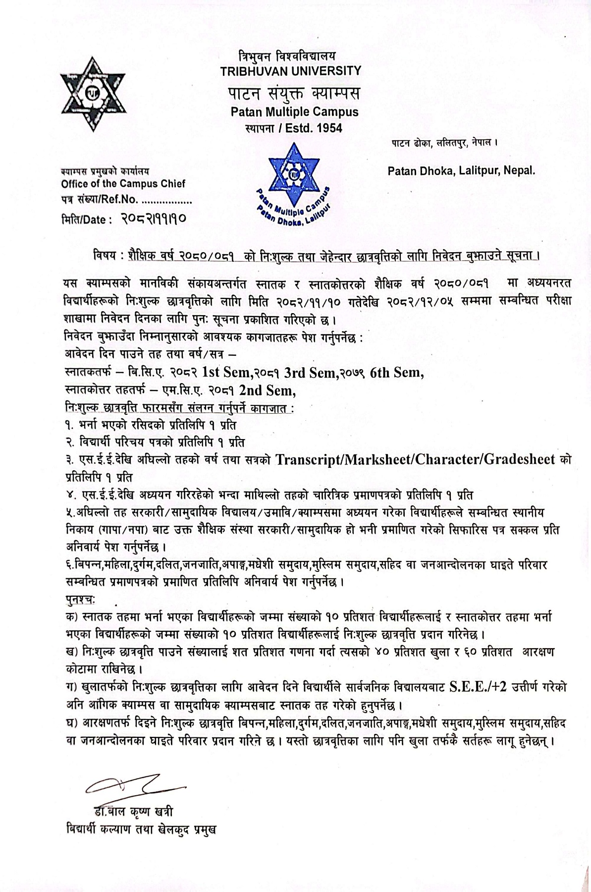 बि.सि.ए र एम.सि.ए कार्यक्रममा निशुल्क तथा जेहेन्दार बिद्यार्थीहरुको छात्रवृतिका लागि निबेदन बुझाउने सम्बन्धि सूचना