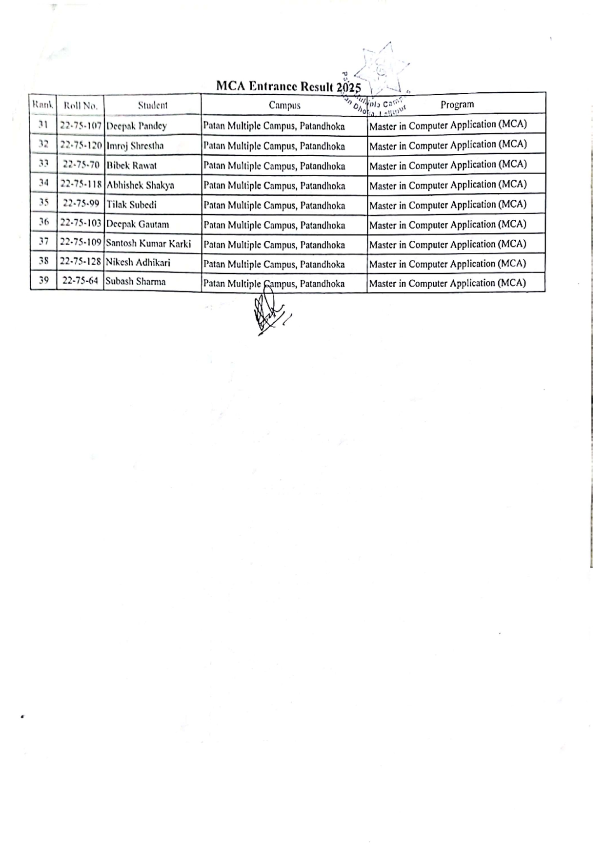 MCA-First Merit List for Admission-2082