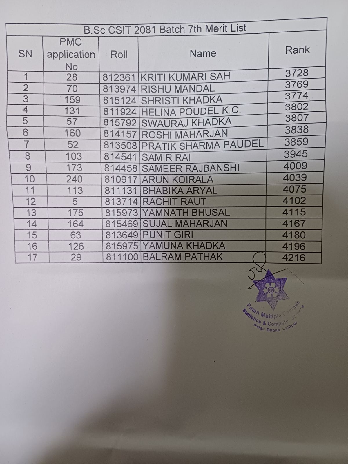 B.Sc CSIT 7th Merit Lists for Admission
