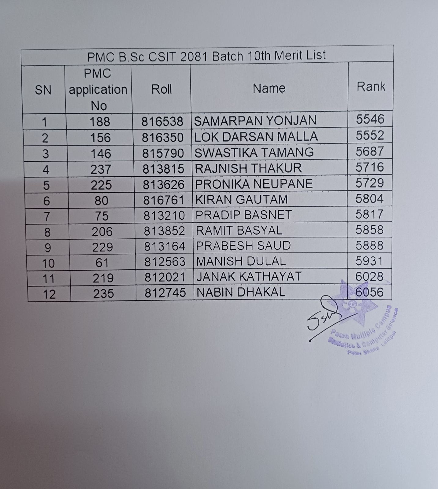 B.Sc CSIT 10th Merit Lists for Admission