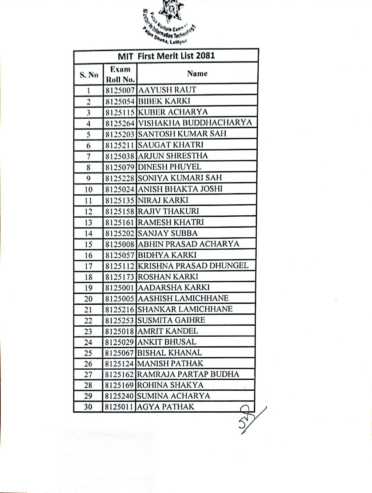 MIT 2081 Merit list for Admission