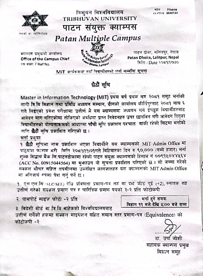 बि.सि.ए र एम.सि.ए कार्यक्रममा निशुल्क तथा जेहेन्दार बिद्यार्थीहरुको छात्रवृतिका लागि निबेदन बुझाउने सम्बन्धि सूचना