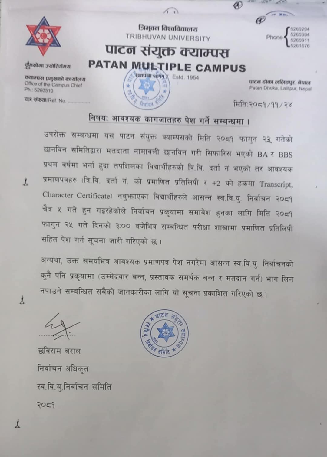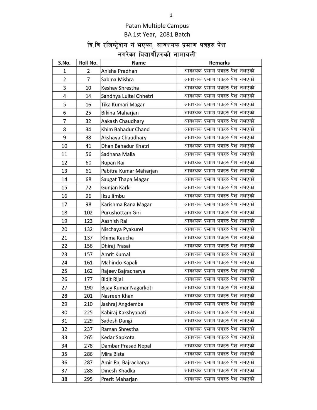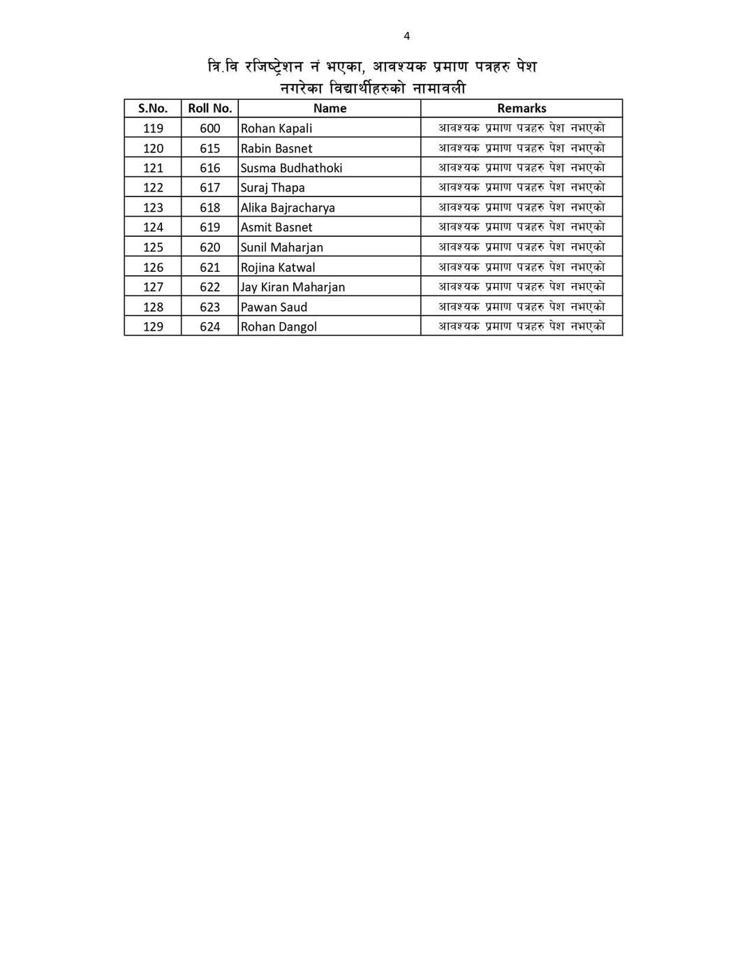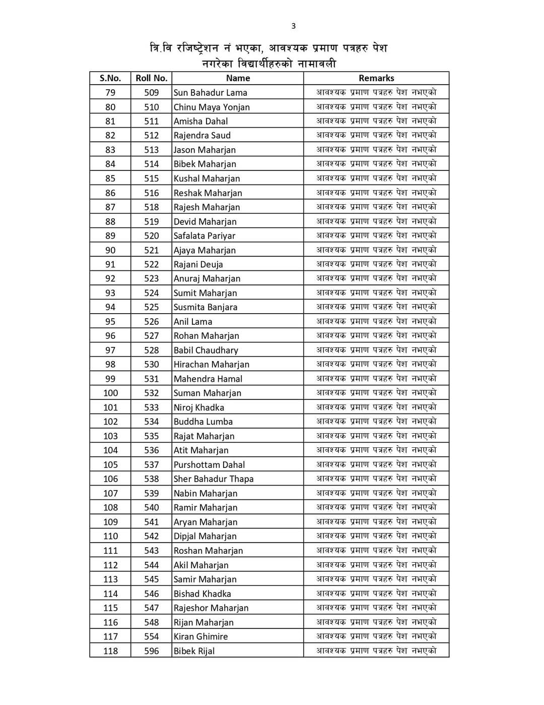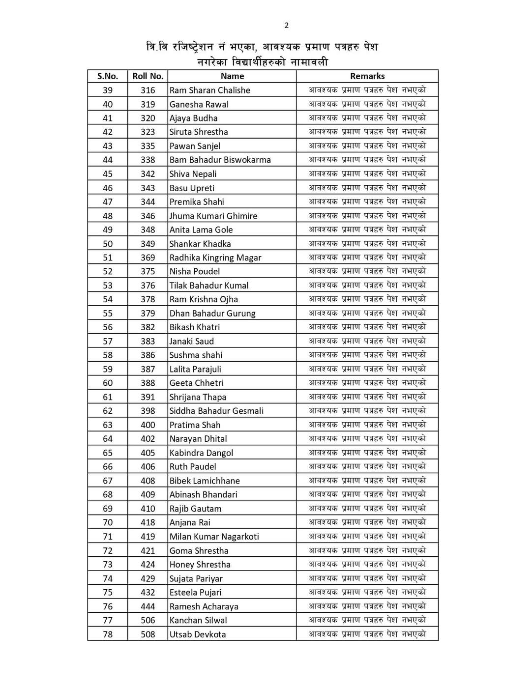 त्रि वि दर्ता नं भई आवश्यक प्रमाणित प्रमाणपत्र नभएका विद्यार्थीहरूको सूची