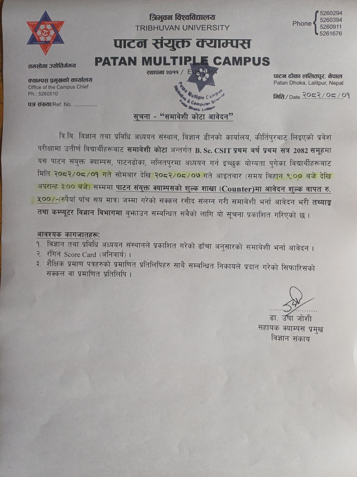 समाबेशी कोटा आवेदन सम्बन्धि सूचना-B.Sc CSIT