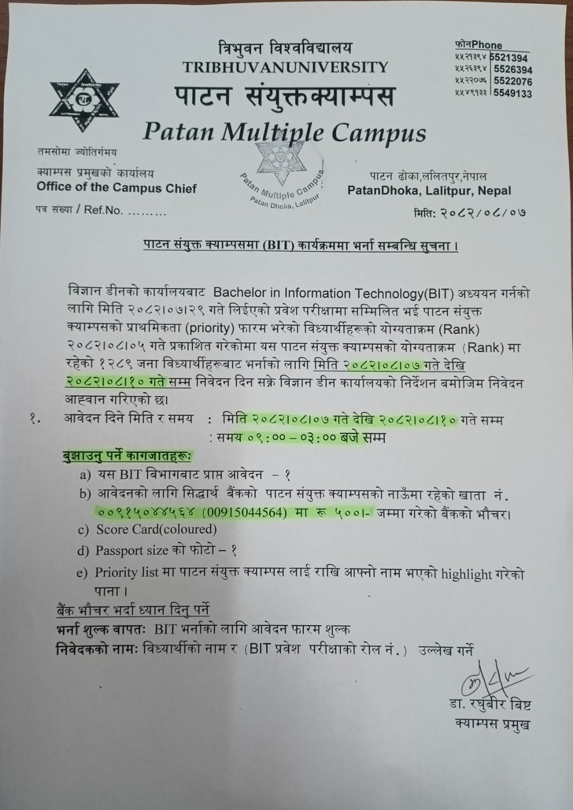 BIT कार्यक्रममा भर्ना सम्बन्धी सूचना